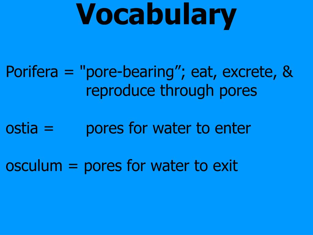 Vocabulary Porifera = "pore-bearing”; eat, excrete, & reproduce through pores ostia = pores for water to enter osculum = pores for water to exit