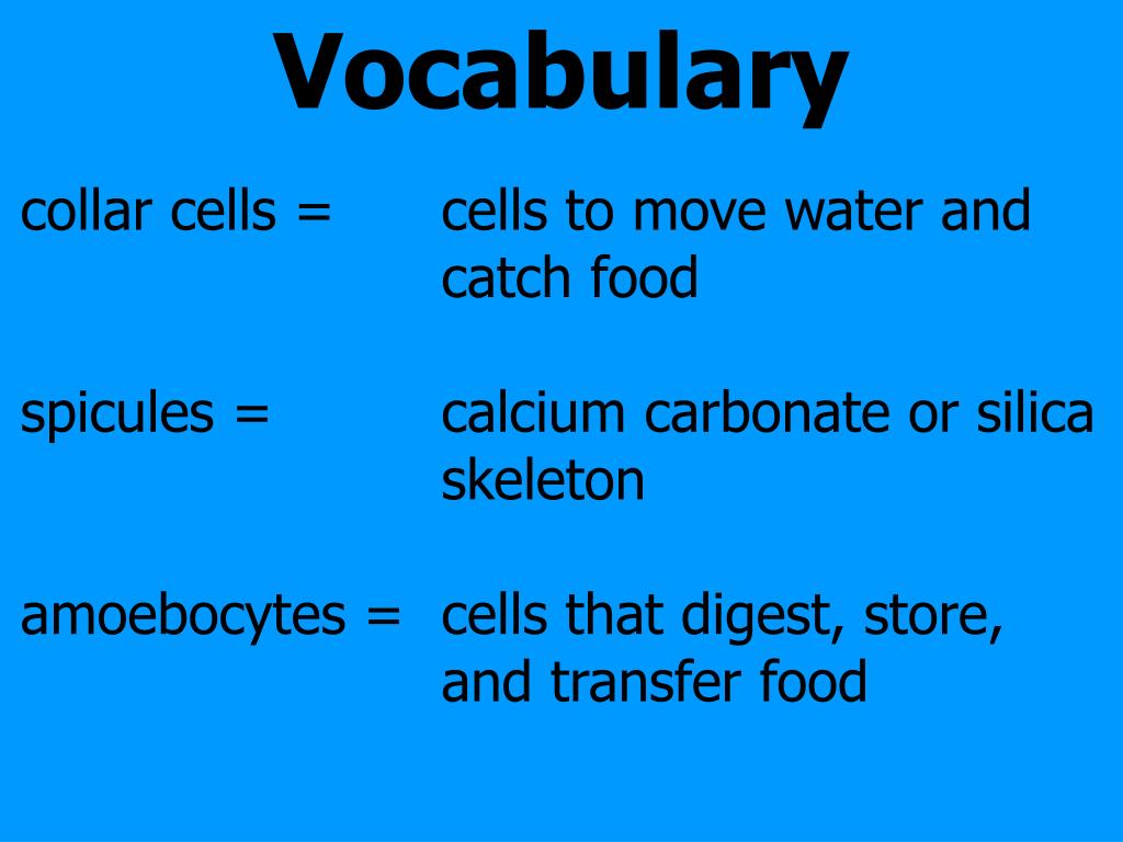 Vocabulary collar cells = cells to move water and catch food spicules = calcium carbonate or silica skeleton amoebocytes = cells that digest, store, and transfer food