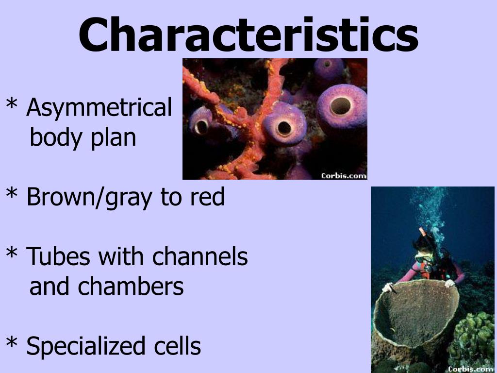 Characteristics * Asymmetrical body plan * Brown/gray to red * Tubes with channels and chambers * Specialized cells