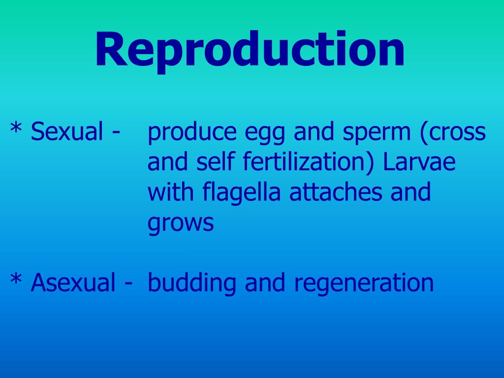 Reproduction * Sexual - produce egg and sperm (cross and self fertilization) Larvae with flagella attaches and grows * Asexual - budding and regeneration