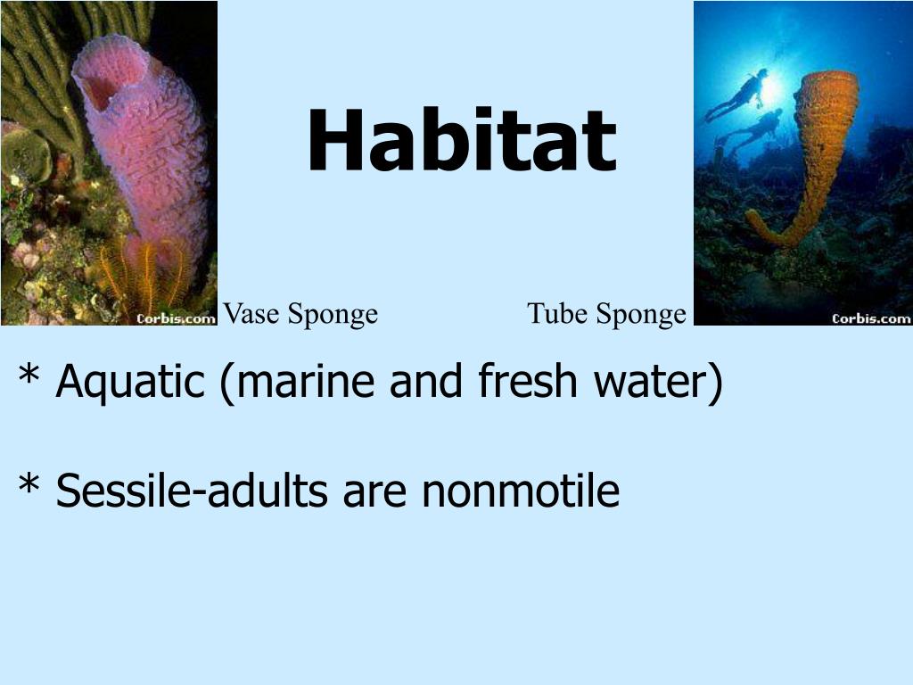 Habitat * Aquatic (marine and fresh water) * Sessile-adults are nonmotile Vase Sponge Tube Sponge