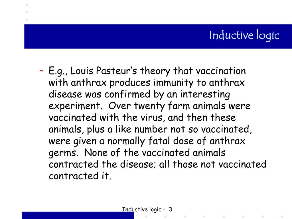 Inductive logic • E.g., Louis Pasteur’s theory that vaccination with anthrax produces immunity to anthrax disease was confirmed by an interesting experiment. Over twenty farm animals were vaccinated with the virus, and then these animals, plus a like number not so vaccinated, were given a normally fatal dose of anthrax germs. None of the vaccinated animals contracted the disease; all those not vaccinated contracted it. Inductive logic - 3
