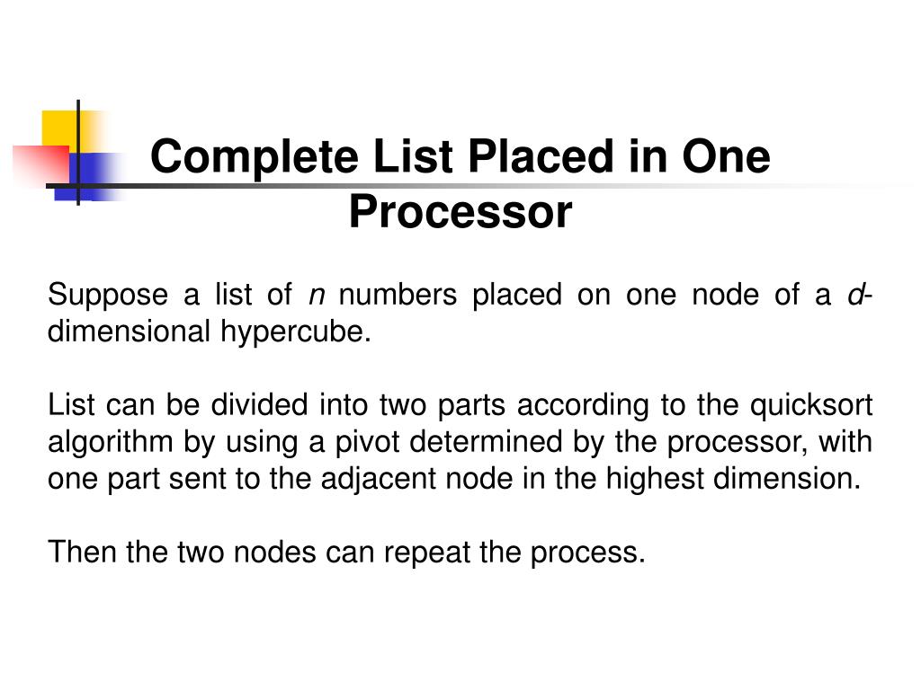 Complete List Placed in One Processor Suppose a list of n numbers placed on one node of a d-dimensional hypercube. List can be divided into two parts according to the quicksort algorithm by using a pivot determined by the processor, with one part sent to the adjacent node in the highest dimension. Then the two nodes can repeat the process.