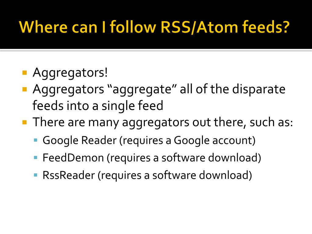 Where can I follow RSS/Atom feeds? • Aggregators! • Aggregators “aggregate” all of the disparate feeds into a single feed • There are many aggregators out there, such as: • Google Reader (requires a Google account) • FeedDemon (requires a software download) • RssReader (requires a software download)
