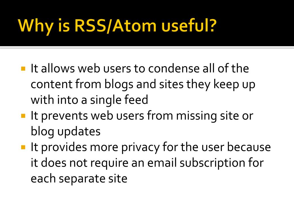 Why is RSS/Atom useful? • It allows web users to condense all of the content from blogs and sites they keep up with into a single feed • It prevents web users from missing site or blog updates • It provides more privacy for the user because it does not require an email subscription for each separate site