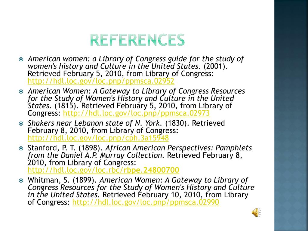 References • American women: a Library of Congress guide for the study of women's history and Culture in the United States. (2001). Retrieved February 5, 2010, from Library of Congress: http://hdl.loc.gov/loc.pnp/ppmsca.02952 • American Women: A Gateway to Library of Congress Resources for the Study of Women's History and Culture in the United States. (1815). Retrieved February 5, 2010, from Library of Congress: http://hdl.loc.gov/loc.pnp/ppmsca.02973 • Shakers near Lebanon state of N. York. (1830). Retrieved February 8, 2010, from Library of Congress: http://hdl.loc.gov/loc.pnp/cph.3a15948 • Stanford, P. T. (1898). African American Perspectives: Pamphlets from the Daniel A.P. Murray Collection. Retrieved February 8, 2010, from Library of Congress: http://hdl.loc.gov/loc.rbc/rbpe.24800700 • Whitman, S. (1899). American Women: A Gateway to Library of Congress Resources for the Study of Women's History and Culture in the United States. Retrieved February 10, 2010, from Library of Congress: http://hdl.loc.gov/loc.pnp/ppmsca.02990