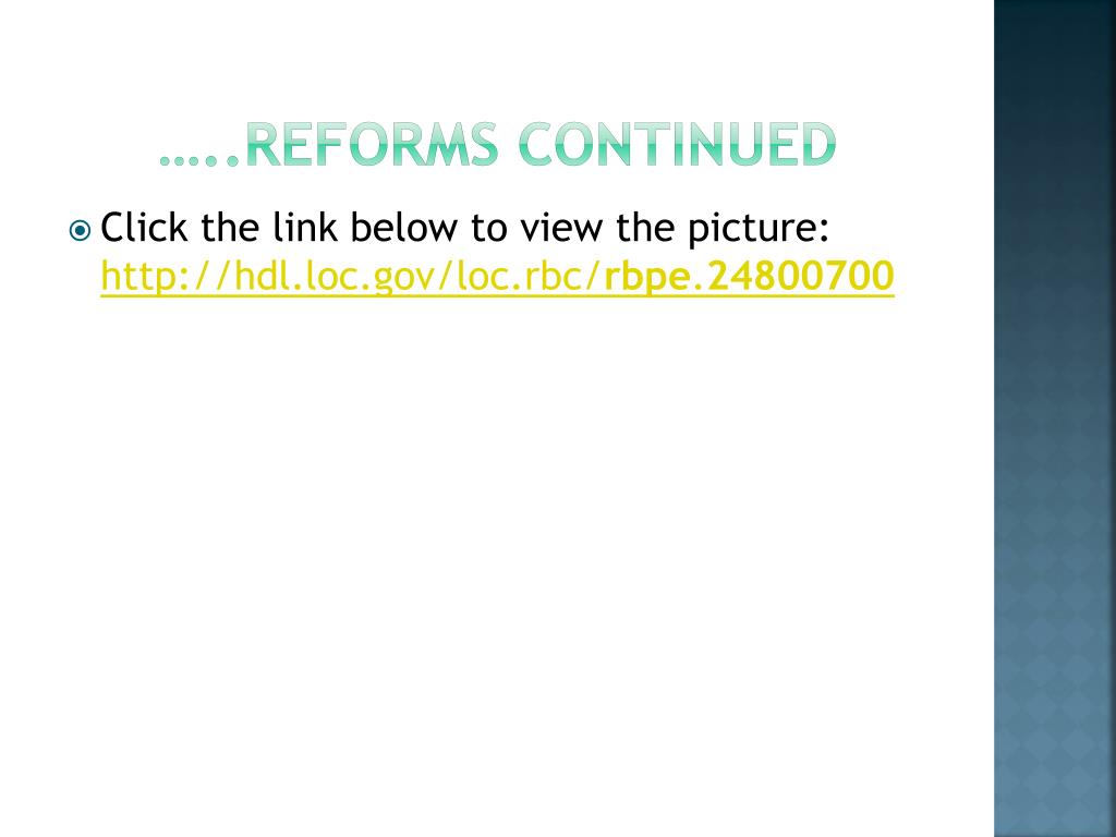 …..reforms continued • Click the link below to view the picture: http://hdl.loc.gov/loc.rbc/rbpe.24800700