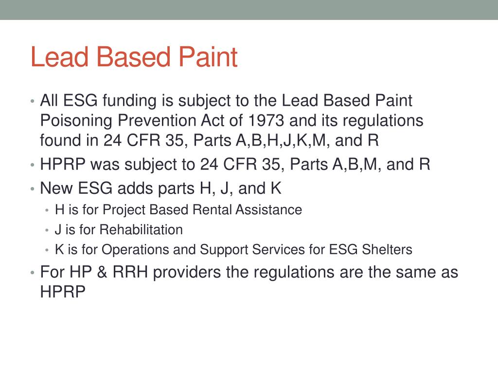 Lead Based Paint • All ESG funding is subject to the Lead Based Paint Poisoning Prevention Act of 1973 and its regulations found in 24 CFR 35, Parts A,B,H,J,K,M, and R • HPRP was subject to 24 CFR 35, Parts A,B,M, and R • New ESG adds parts H, J, and K • H is for Project Based Rental Assistance • J is for Rehabilitation • K is for Operations and Support Services for ESG Shelters • For HP & RRH providers the regulations are the same as HPRP