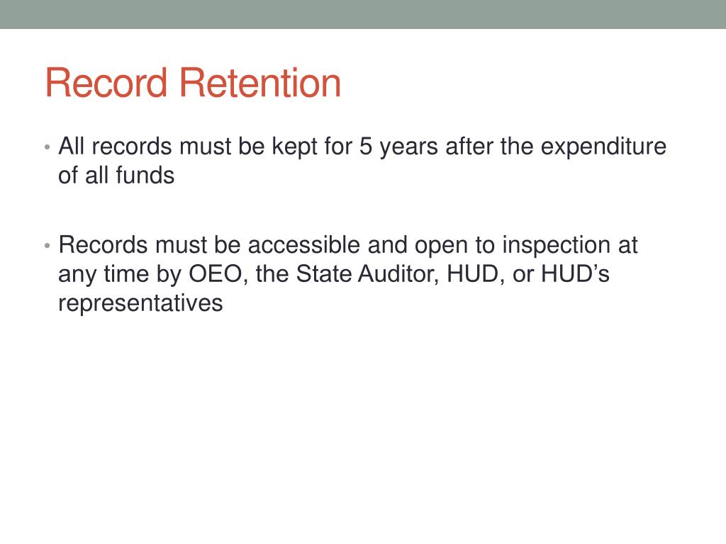 Record Retention • All records must be kept for 5 years after the expenditure of all funds • Records must be accessible and open to inspection at any time by OEO, the State Auditor, HUD, or HUD’s representatives