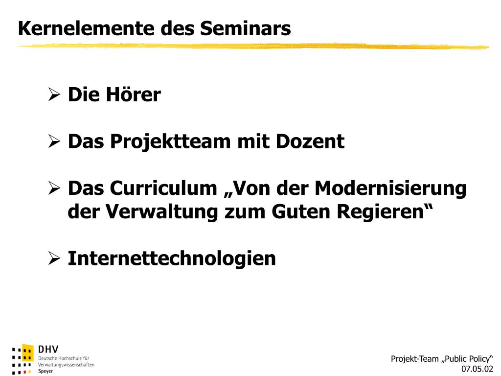 Kernelemente des Seminars • Die Hörer • Das Projektteam mit Dozent • Das Curriculum „Von der Modernisierung der Verwaltung zum Guten Regieren“ • Internettechnologien FÖV