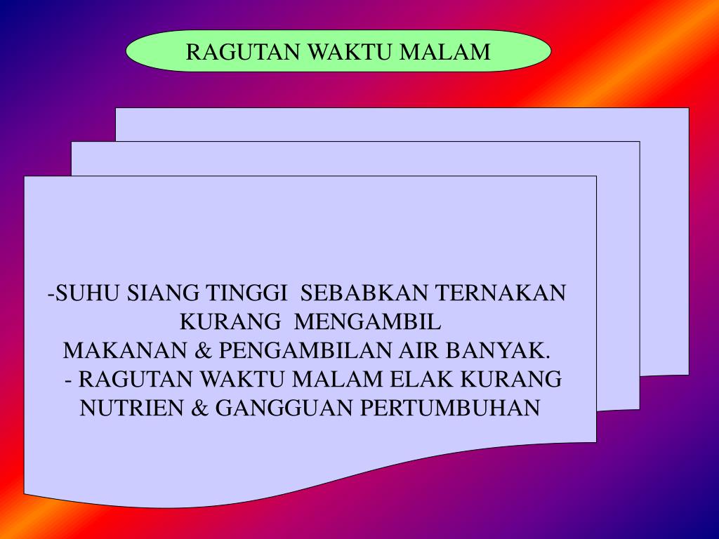 RAGUTAN WAKTU MALAM • SUHU SIANG TINGGI SEBABKAN TERNAKAN • KURANG MENGAMBIL • MAKANAN & PENGAMBILAN AIR BANYAK. • - RAGUTAN WAKTU MALAM ELAK KURANG • NUTRIEN & GANGGUAN PERTUMBUHAN