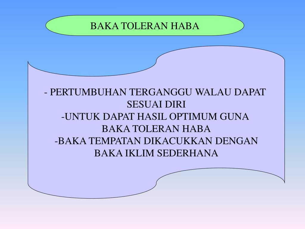 BAKA TOLERAN HABA • PERTUMBUHAN TERGANGGU WALAU DAPAT • SESUAI DIRI • UNTUK DAPAT HASIL OPTIMUM GUNA • BAKA TOLERAN HABA • BAKA TEMPATAN DIKACUKKAN DENGAN • BAKA IKLIM SEDERHANA