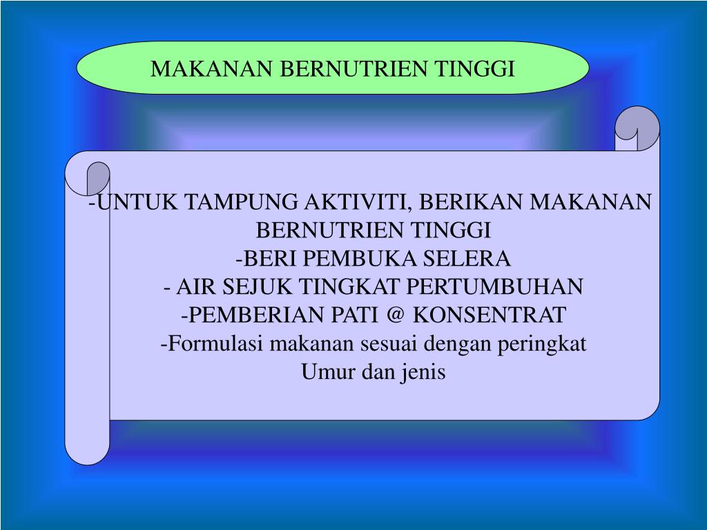 MAKANAN BERNUTRIEN TINGGI • UNTUK TAMPUNG AKTIVITI, BERIKAN MAKANAN • BERNUTRIEN TINGGI • BERI PEMBUKA SELERA • AIR SEJUK TINGKAT PERTUMBUHAN • PEMBERIAN PATI @ KONSENTRAT • Formulasi makanan sesuai dengan peringkat • Umur dan jenis