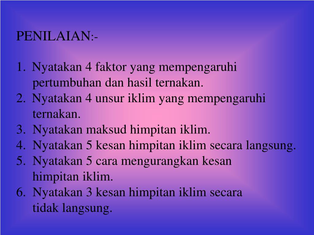 PENILAIAN:- • Nyatakan 4 faktor yang mempengaruhi • pertumbuhan dan hasil ternakan. • Nyatakan 4 unsur iklim yang mempengaruhi • ternakan. • 3. Nyatakan maksud himpitan iklim. • 4. Nyatakan 5 kesan himpitan iklim secara langsung. • 5. Nyatakan 5 cara mengurangkan kesan • himpitan iklim. • 6. Nyatakan 3 kesan himpitan iklim secara • tidak langsung.