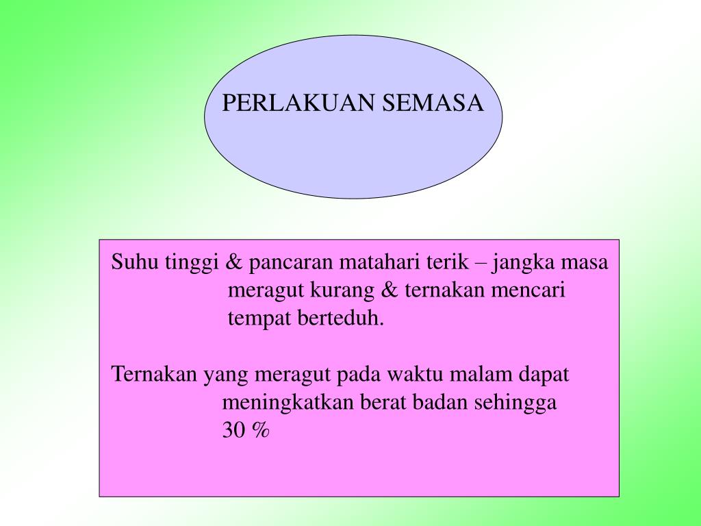 PERLAKUAN SEMASA MERAGUT Suhu tinggi & pancaran matahari terik – jangka masa meragut kurang & ternakan mencari tempat berteduh. Ternakan yang meragut pada waktu malam dapat meningkatkan berat badan sehingga 30 %