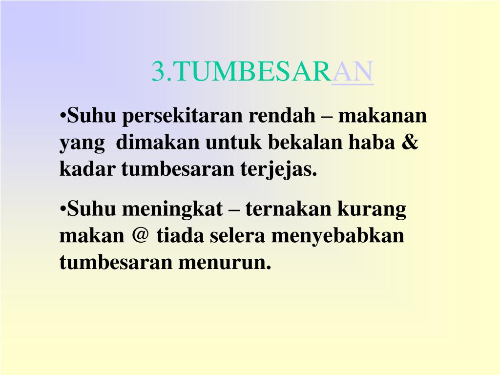 3.TUMBESARAN • Suhu persekitaran rendah – makanan yang dimakan untuk bekalan haba & kadar tumbesaran terjejas. • Suhu meningkat – ternakan kurang makan @ tiada selera menyebabkan tumbesaran menurun.