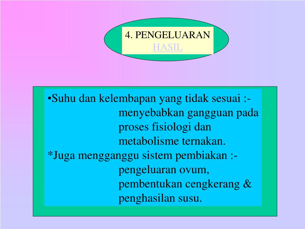 4. PENGELUARAN HASIL • Suhu dan kelembapan yang tidak sesuai :- • menyebabkan gangguan pada • proses fisiologi dan • metabolisme ternakan. • *Juga mengganggu sistem pembiakan :- • pengeluaran ovum, • pembentukan cengkerang & • penghasilan susu.