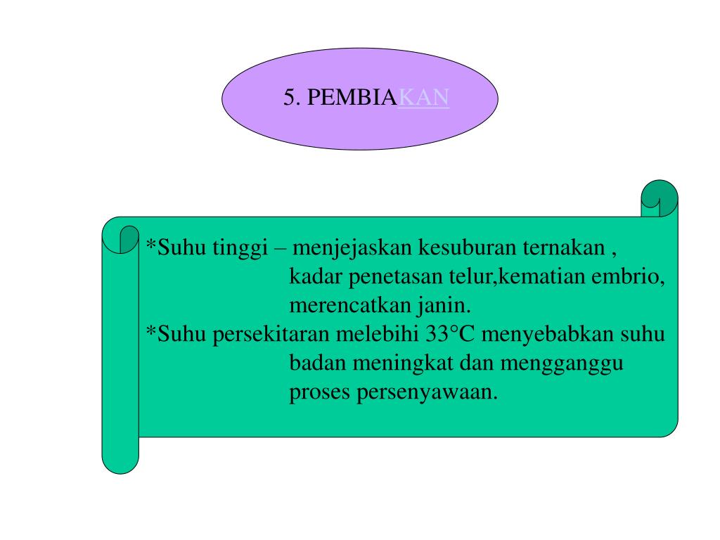 5. PEMBIAKAN *Suhu tinggi – menjejaskan kesuburan ternakan , kadar penetasan telur,kematian embrio, merencatkan janin. *Suhu persekitaran melebihi 33°C menyebabkan suhu badan meningkat dan mengganggu proses persenyawaan.