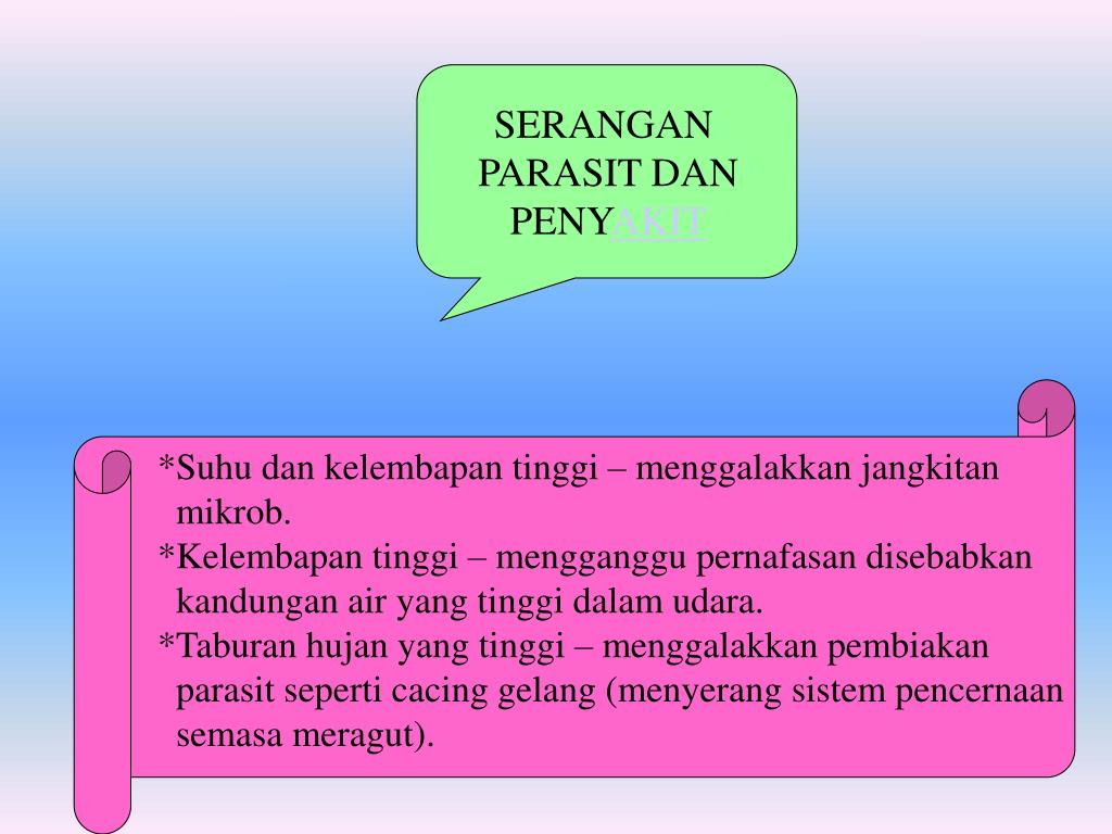 SERANGAN PARASIT DAN PENYAKIT *Suhu dan kelembapan tinggi – menggalakkan jangkitan mikrob. *Kelembapan tinggi – mengganggu pernafasan disebabkan kandungan air yang tinggi dalam udara. *Taburan hujan yang tinggi – menggalakkan pembiakan parasit seperti cacing gelang (menyerang sistem pencernaan semasa meragut).