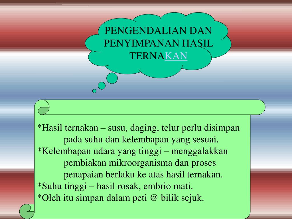 PENGENDALIAN DAN PENYIMPANAN HASIL TERNAKAN *Hasil ternakan – susu, daging, telur perlu disimpan pada suhu dan kelembapan yang sesuai. *Kelembapan udara yang tinggi – menggalakkan pembiakan mikroorganisma dan proses penapaian berlaku ke atas hasil ternakan. *Suhu tinggi – hasil rosak, embrio mati. *Oleh itu simpan dalam peti @ bilik sejuk.