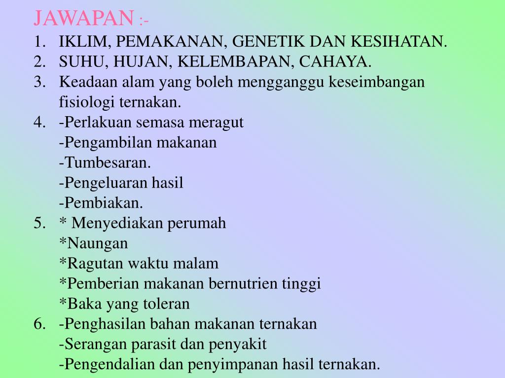 JAWAPAN :- • IKLIM, PEMAKANAN, GENETIK DAN KESIHATAN. • SUHU, HUJAN, KELEMBAPAN, CAHAYA. • Keadaan alam yang boleh mengganggu keseimbangan • fisiologi ternakan. • -Perlakuan semasa meragut -Pengambilan makanan -Tumbesaran. -Pengeluaran hasil -Pembiakan. • * Menyediakan perumah *Naungan *Ragutan waktu malam *Pemberian makanan bernutrien tinggi *Baka yang toleran • -Penghasilan bahan makanan ternakan -Serangan parasit dan penyakit -Pengendalian dan penyimpanan hasil ternakan.