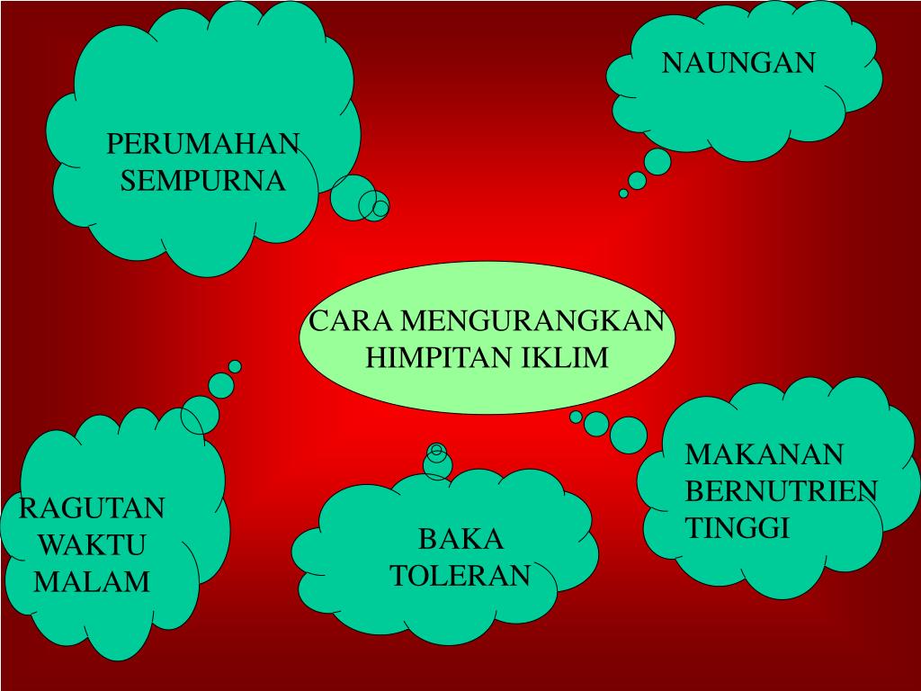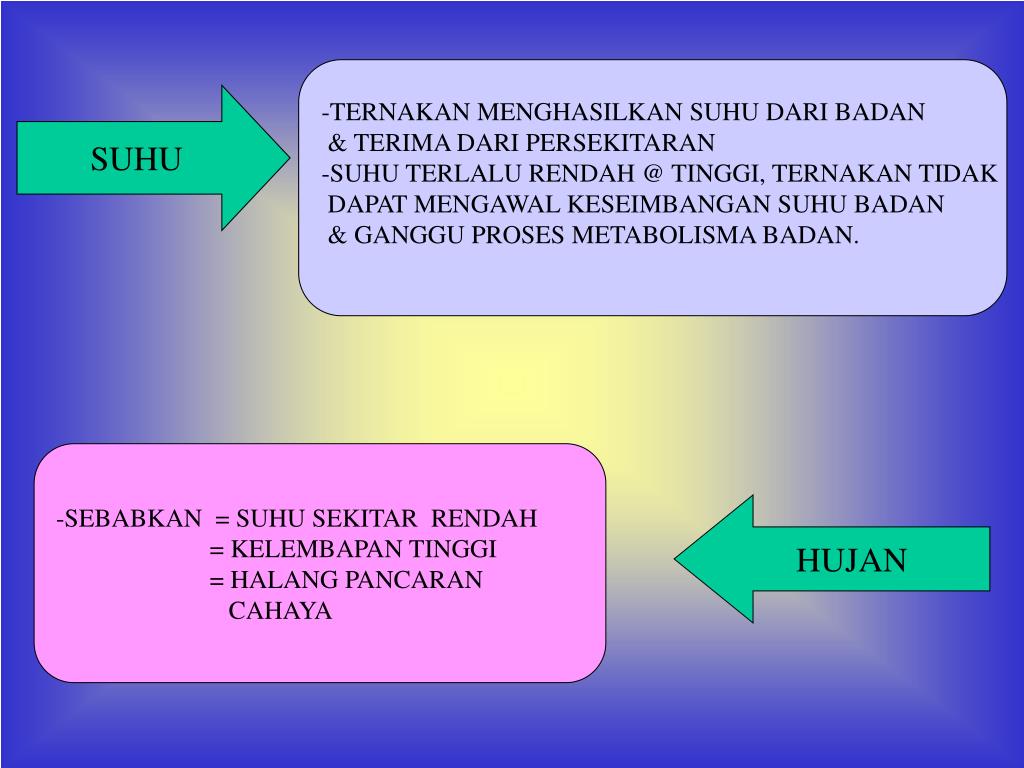 TERNAKAN MENGHASILKAN SUHU DARI BADAN • & TERIMA DARI PERSEKITARAN • SUHU TERLALU RENDAH @ TINGGI, TERNAKAN TIDAK • DAPAT MENGAWAL KESEIMBANGAN SUHU BADAN • & GANGGU PROSES METABOLISMA BADAN. SUHU • SEBABKAN = SUHU SEKITAR RENDAH • = KELEMBAPAN TINGGI • = HALANG PANCARAN • CAHAYA HUJAN