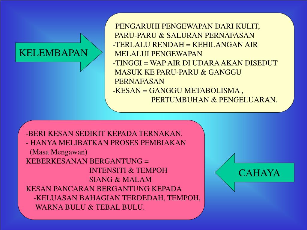 PENGARUHI PENGEWAPAN DARI KULIT, • PARU-PARU & SALURAN PERNAFASAN • TERLALU RENDAH = KEHILANGAN AIR • MELALUI PENGEWAPAN • TINGGI = WAP AIR DI UDARA AKAN DISEDUT • MASUK KE PARU-PARU & GANGGU • PERNAFASAN • KESAN = GANGGU METABOLISMA , • PERTUMBUHAN & PENGELUARAN. KELEMBAPAN • BERI KESAN SEDIKIT KEPADA TERNAKAN. • HANYA MELIBATKAN PROSES PEMBIAKAN • (Masa Mengawan) • KEBERKESANAN BERGANTUNG = • INTENSITI & TEMPOH • SIANG & MALAM • KESAN PANCARAN BERGANTUNG KEPADA • -KELUASAN BAHAGIAN TERDEDAH, TEMPOH, • WARNA BULU & TEBAL BULU. CAHAYA
