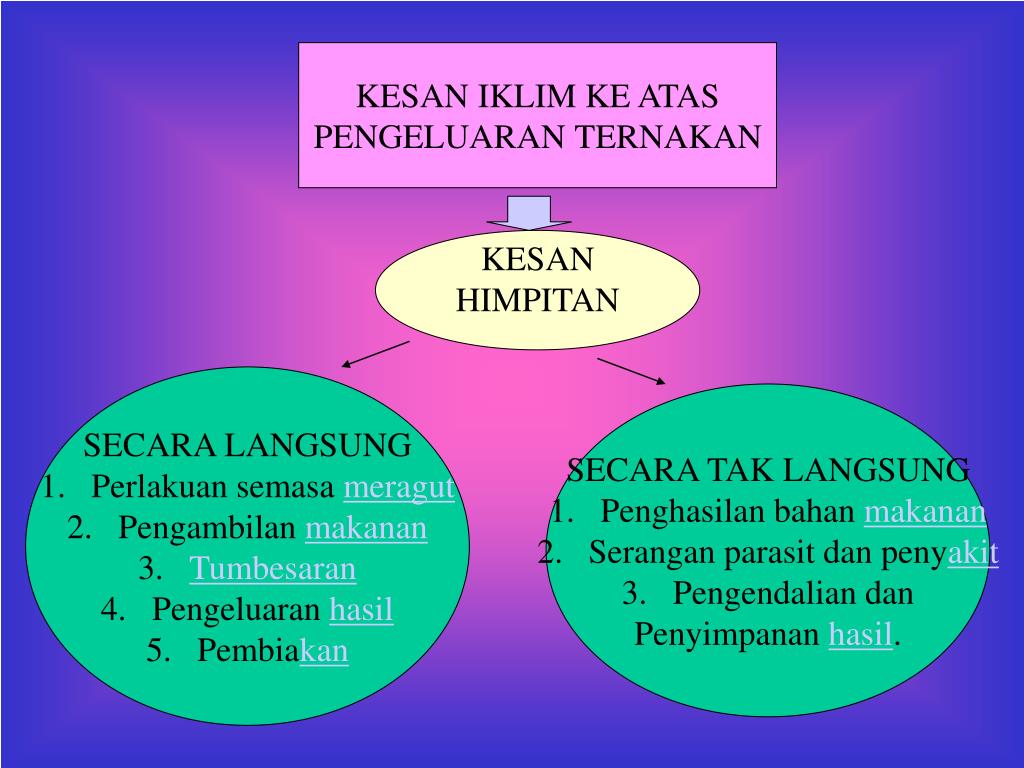 KESAN IKLIM KE ATAS PENGELUARAN TERNAKAN KESAN HIMPITAN • SECARA LANGSUNG • Perlakuan semasa meragut • Pengambilan makanan • Tumbesaran • Pengeluaran hasil • Pembiakan • SECARA TAK LANGSUNG • Penghasilan bahan makanan • Serangan parasit dan penyakit • Pengendalian dan • Penyimpanan hasil.