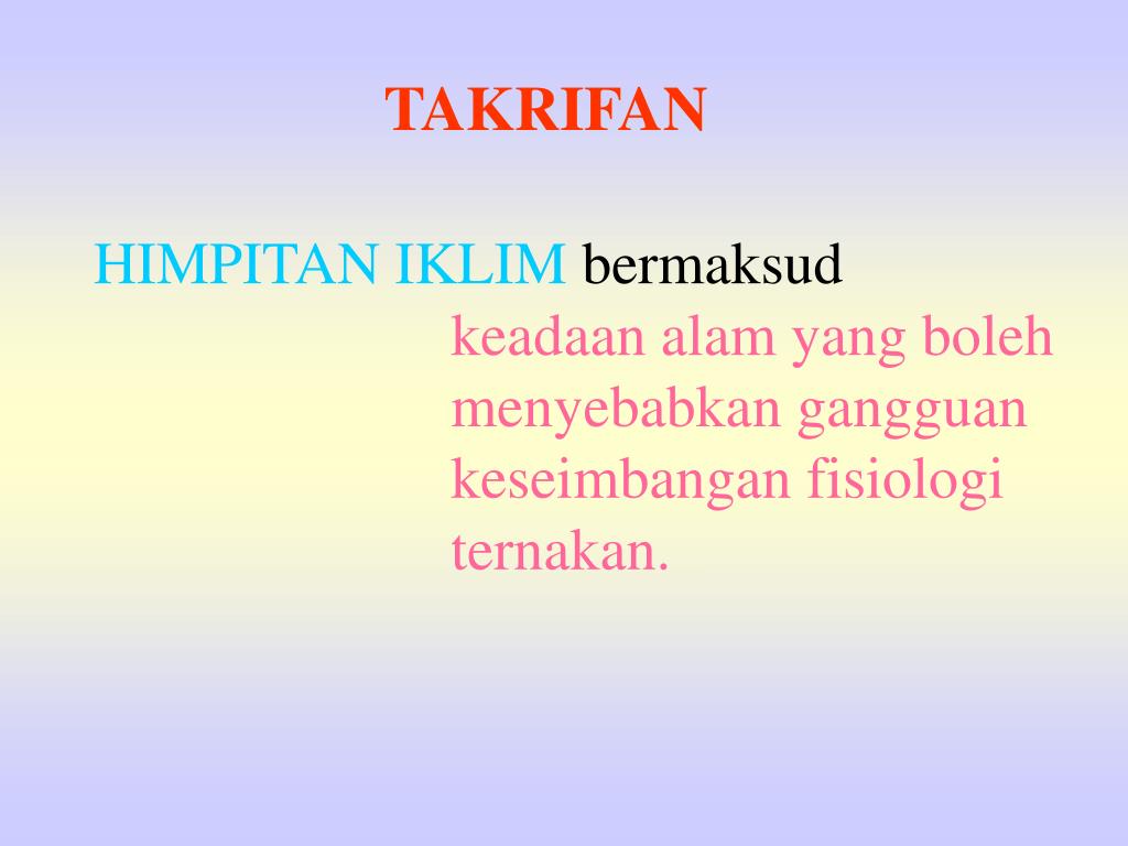 TAKRIFAN HIMPITAN IKLIM bermaksud keadaan alam yang boleh menyebabkan gangguan keseimbangan fisiologi ternakan.