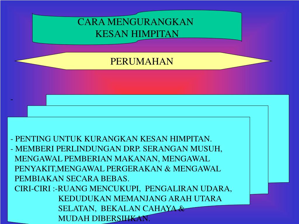 CARA MENGURANGKAN KESAN HIMPITAN PERUMAHAN • PENTING UNTUK KURANGKAN KESAN HIMPITAN. • MEMBERI PERLINDUNGAN DRP. SERANGAN MUSUH, • MENGAWAL PEMBERIAN MAKANAN, MENGAWAL • PENYAKIT,MENGAWAL PERGERAKAN & MENGAWAL • PEMBIAKAN SECARA BEBAS. • CIRI-CIRI :-RUANG MENCUKUPI, PENGALIRAN UDARA, • KEDUDUKAN MEMANJANG ARAH UTARA • SELATAN, BEKALAN CAHAYA & • MUDAH DIBERSIHKAN.