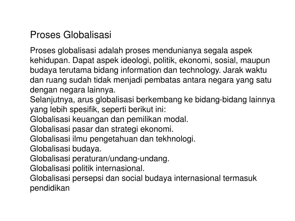 Proses Globalisasi Proses globalisasi adalah proses mendunianya segala aspek kehidupan. Dapat aspek ideologi, politik, ekonomi, sosial, maupun budaya terutama bidang information dan technology. Jarak waktu dan ruang sudah tidak menjadi pembatas antara negara yang satu dengan negara lainnya. Selanjutnya, arus globalisasi berkembang ke bidang-bidang lainnya yang lebih spesifik, seperti berikut ini: Globalisasi keuangan dan pemilikan modal. Globalisasi pasar dan strategi ekonomi. Globalisasi ilmu pengetahuan dan tekhnologi. Globalisasi budaya. Globalisasi peraturan/undang-undang. Globalisasi politik internasional. Globalisasi persepsi dan social budaya internasional termasuk pendidikan