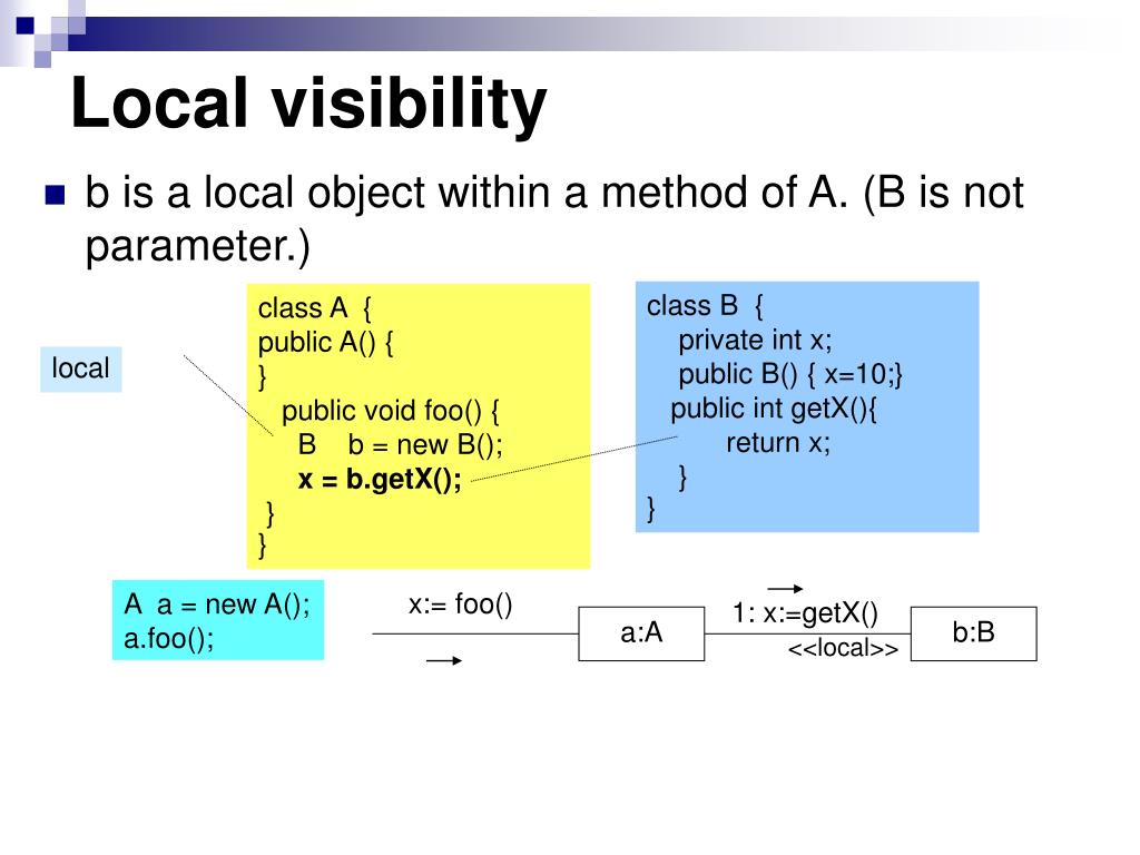 Local visibility • b is a local object within a method of A. (B is not parameter.) class B { private int x; public B() { x=10;} public int getX(){ return x; } } class A { public A() { } public void foo() { B b = new B(); x = b.getX(); } } local A a = new A(); a.foo(); x:= foo() 1: x:=getX() a:A b:B <<local>>