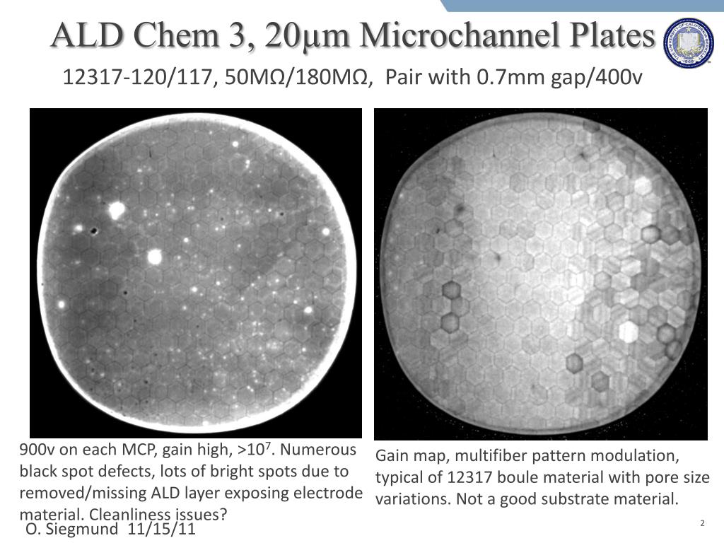 ALD Chem 3, 20µm Microchannel Plates 12317-120/117, 50MΩ/180MΩ, Pair with 0.7mm gap/400v 900v on each MCP, gain high, >107. Numerous black spot defects, lots of bright spots due to removed/missing ALD layer exposing electrode material. Cleanliness issues? Gain map, multifiber pattern modulation, typical of 12317 boule material with pore size variations. Not a good substrate material.