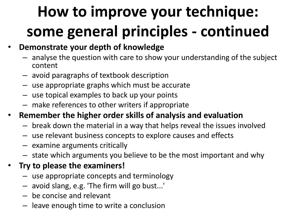 How to improve your technique: some general principles - continued • Demonstrate your depth of knowledge • analyse the question with care to show your understanding of the subject content • avoid paragraphs of textbook description • use appropriate graphs which must be accurate • use topical examples to back up your points • make references to other writers if appropriate • Remember the higher order skills of analysis and evaluation • break down the material in a way that helps reveal the issues involved • use relevant business concepts to explore causes and effects • examine arguments critically • state which arguments you believe to be the most important and why • Try to please the examiners! • use appropriate concepts and terminology • avoid slang, e.g. 'The firm will go bust...' • be concise and relevant • leave enough time to write a conclusion