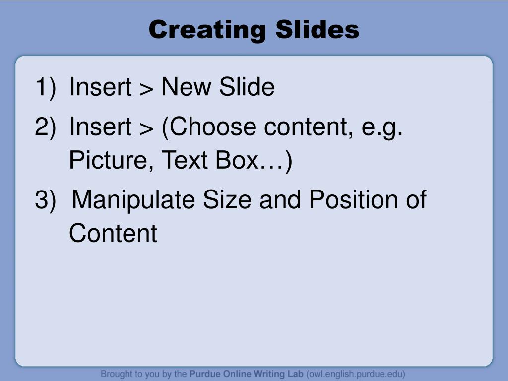 Creating Slides • Insert > New Slide • Insert > (Choose content, e.g. Picture, Text Box…) 3) Manipulate Size and Position of Content