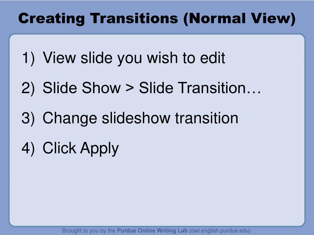 Creating Transitions (Normal View) • View slide you wish to edit • Slide Show > Slide Transition… • Change slideshow transition • Click Apply