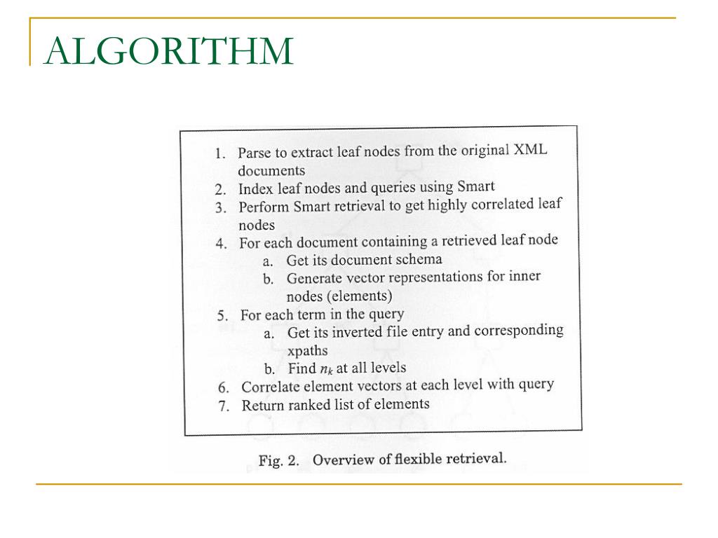 METHOD FOR FLEXIBLE RETRIEVAL • Input – Query Q given and paragraph, retrieve rank ordered list, terminal modes • N top ranked paragraphs as input selected • Set of paragraphs used to identify documents – elements generated and returned as output • Document Tree – Needs information of structure Terminal nodes Pre-order traversal Terminal nodes found in paragraph index