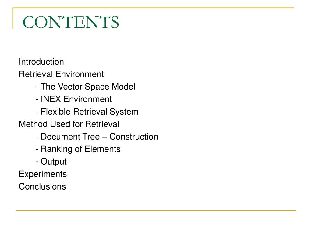 CONTENTS Introduction Retrieval Environment - The Vector Space Model - INEX Environment - Flexible Retrieval System Method Used for Retrieval - Document Tree – Construction - Ranking of Elements - Output Experiments Conclusions