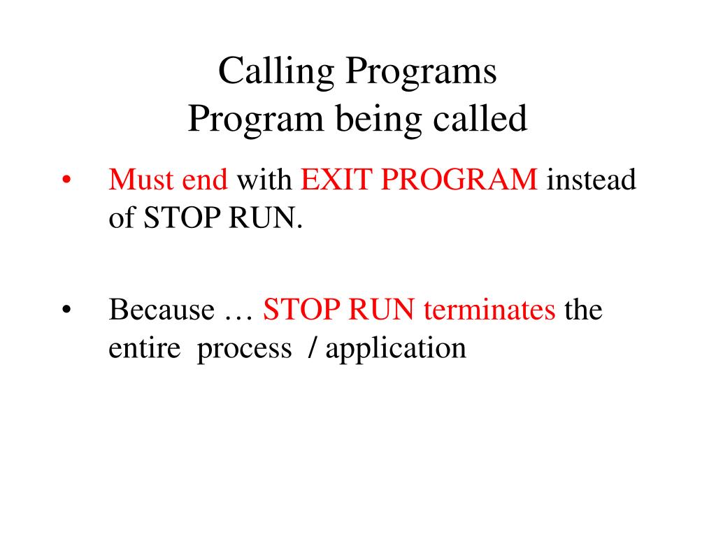 Calling ProgramsProgram being called • Must end with EXIT PROGRAM instead of STOP RUN. • Because … STOP RUN terminates the entire process / application