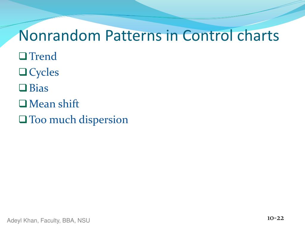 Trend Cycles Bias Mean shift Too much dispersion Nonrandom Patterns in Control charts