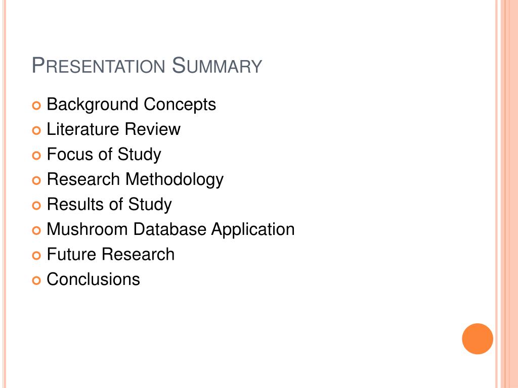 Presentation Summary • Background Concepts • Literature Review • Focus of Study • Research Methodology • Results of Study • Mushroom Database Application • Future Research • Conclusions
