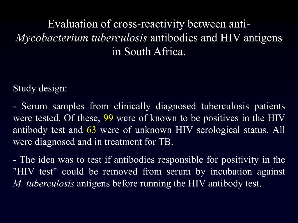 Evaluation of cross-reactivity between anti-Mycobacterium tuberculosis antibodies and HIV antigens in South Africa. Study design: - Serum samples from clinically diagnosed tuberculosis patients were tested. Of these, 99 were of known to be positives in the HIV antibody test and 63 were of unknown HIV serological status. All were diagnosed and in treatment for TB. - The idea was to test if antibodies responsible for positivity in the "HIV test" could be removed from serum by incubation against M. tuberculosis antigens before running the HIV antibody test.