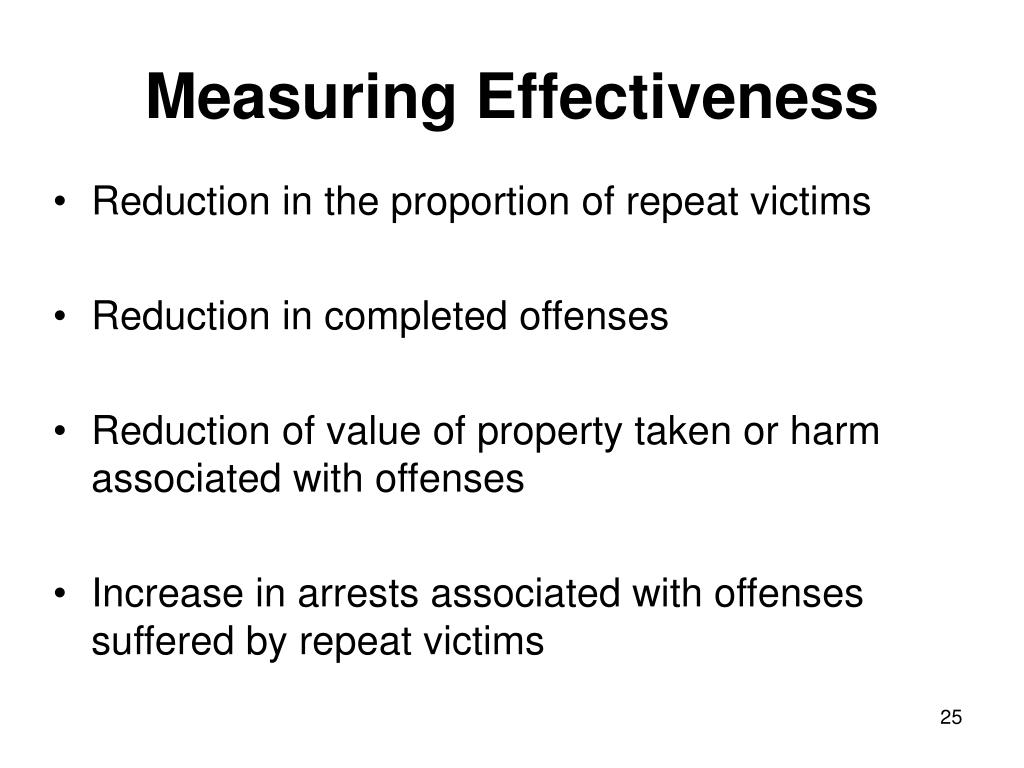 Measuring Effectiveness • Reduction in the proportion of repeat victims • Reduction in completed offenses • Reduction of value of property taken or harm associated with offenses • Increase in arrests associated with offenses suffered by repeat victims