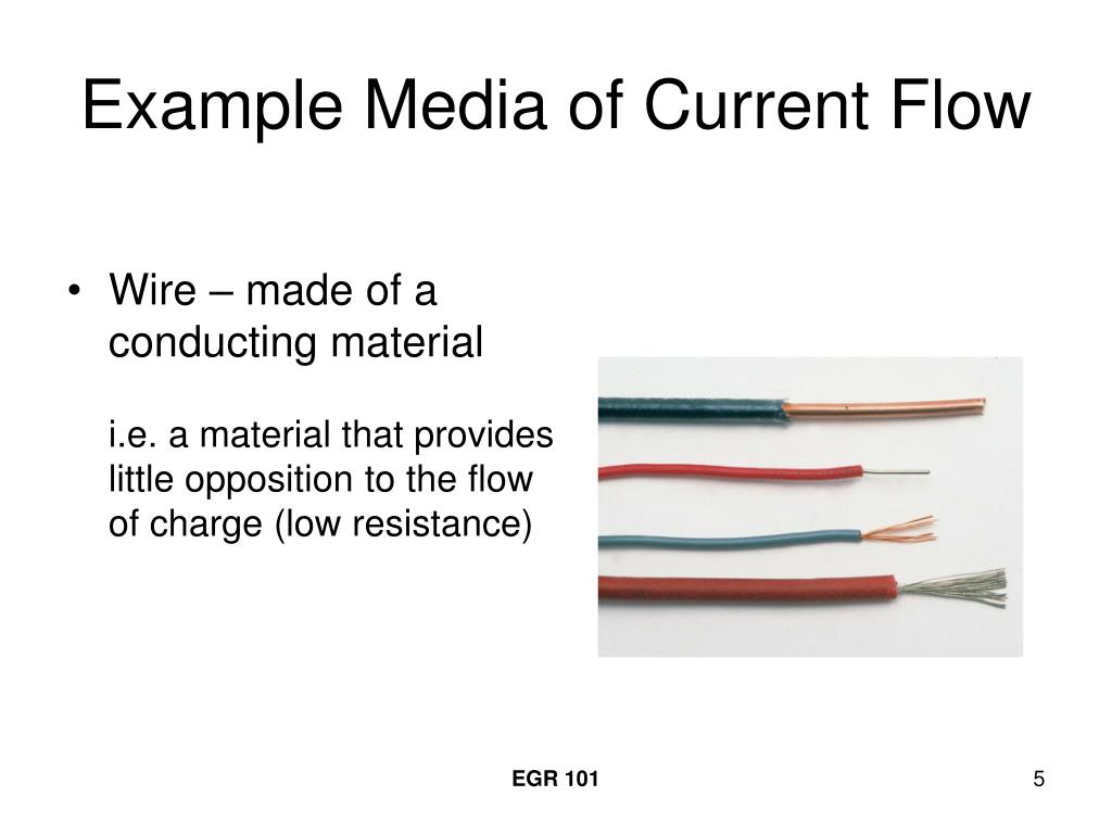 Example Media of Current Flow • Wire – made of a conducting materiali.e. a material that provides little opposition to the flow of charge (low resistance) EGR 101