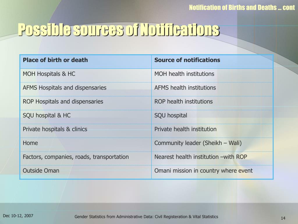 Notification of Births and Deaths … cont Possible sources of Notifications Gender Statistics from Administrative Data: Civil Registeration & Vital Statistics