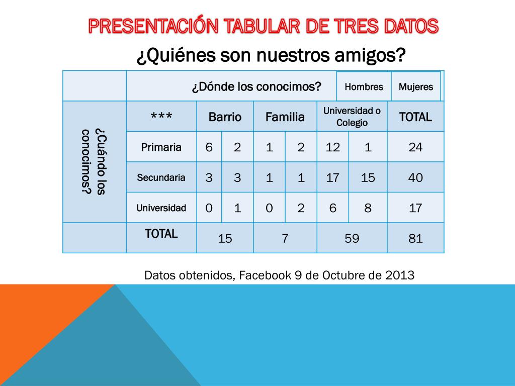 PRESENTACIÓN TABULAR DE TRES DATOS ¿Quiénes son nuestros amigos? Datos obtenidos, Facebook 9 de Octubre de 2013