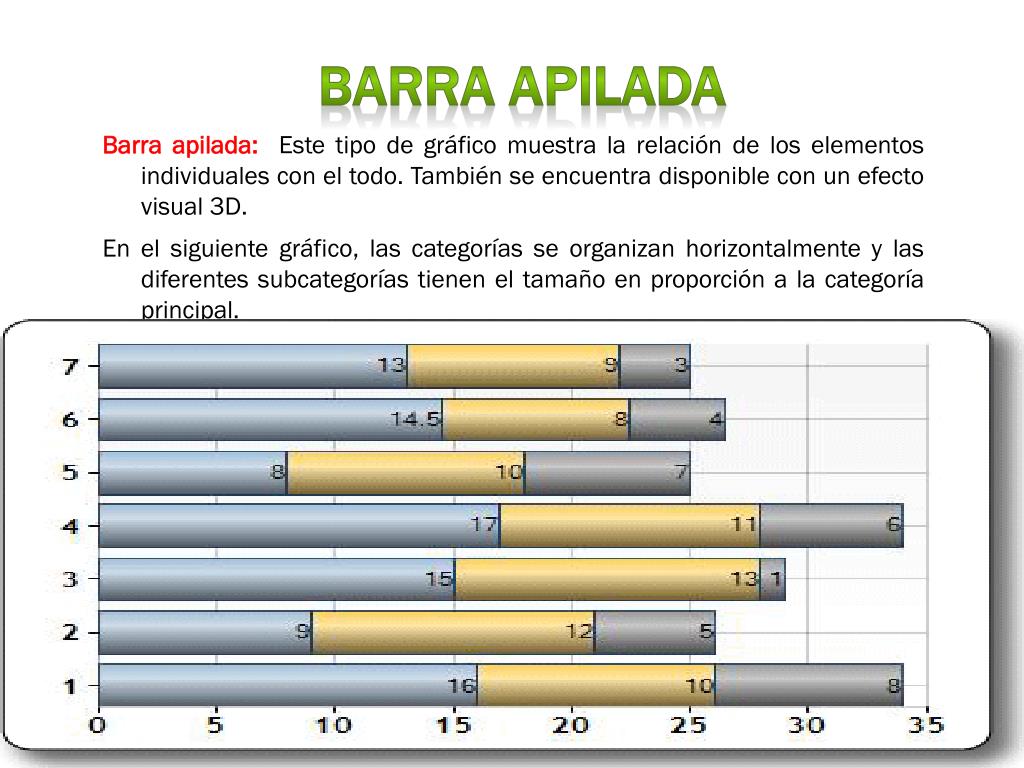 BARRA APILADA • Barra apilada: Este tipo de gráfico muestra la relación de los elementos individuales con el todo. También se encuentra disponible con un efecto visual 3D. • En el siguiente gráfico, las categorías se organizan horizontalmente y las diferentes subcategorías tienen el tamaño en proporción a la categoría principal.