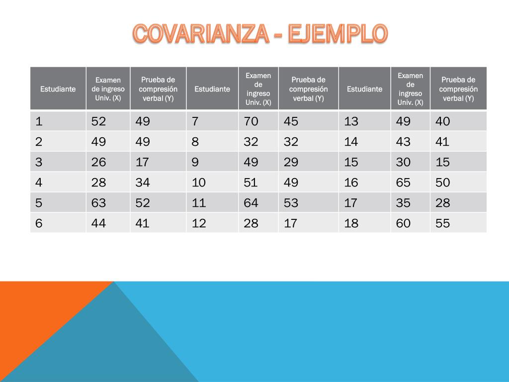 COVARIANZA - EJEMPLO • COVARIANZA: 149.1852 • OJO: • No le demos importancia a la magnitud solamente fijémonos en si es positivo o negativo. • Covarianza >0, hay dependencia directa (positiva), es decir, a grandes valores de x corresponden grandes valores de y. • Covarianza <0, hay dependencia inversa o negativa, es decir, a grandes valores de x corresponden pequeños valores de y. • Covarianza = 0, Una covarianza 0 se interpreta como la no existencia de una relación lineal entre las dos variables estudiadas.