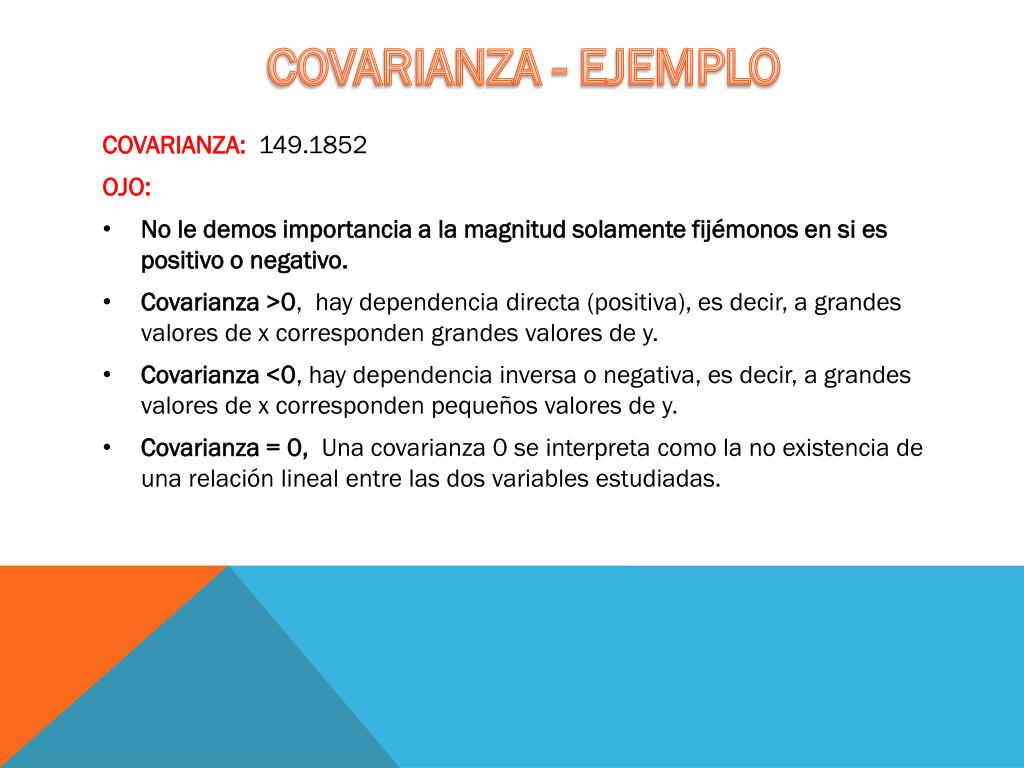 COVARIANZA • BIBLIOGRAFÍA: Haber, Audrey. Runyon, Richard. Estadística general. • Página 123. • Covarianza: Es un calor que indica el grado de variación de dos variables, Es el dato básico para determinar si existe una dependencia entre ambas variables y además es el dato necesario para saber si la relación es positiva o negativa.
