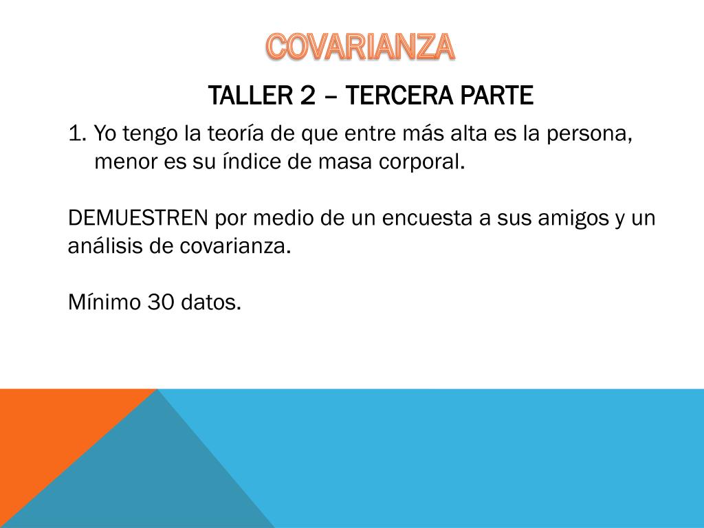 COVARIANZA TALLER 2 – TERCERA PARTE Yo tengo la teoría de que entre más alta es la persona, menor es su índice de masa corporal. DEMUESTREN por medio de un encuesta a sus amigos y un análisis de covarianza. Mínimo 30 datos.